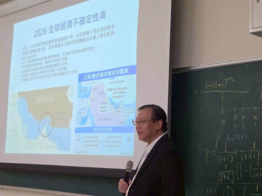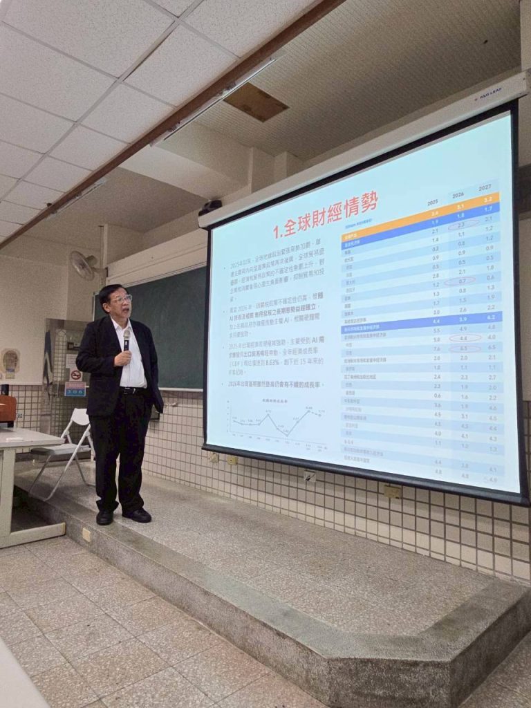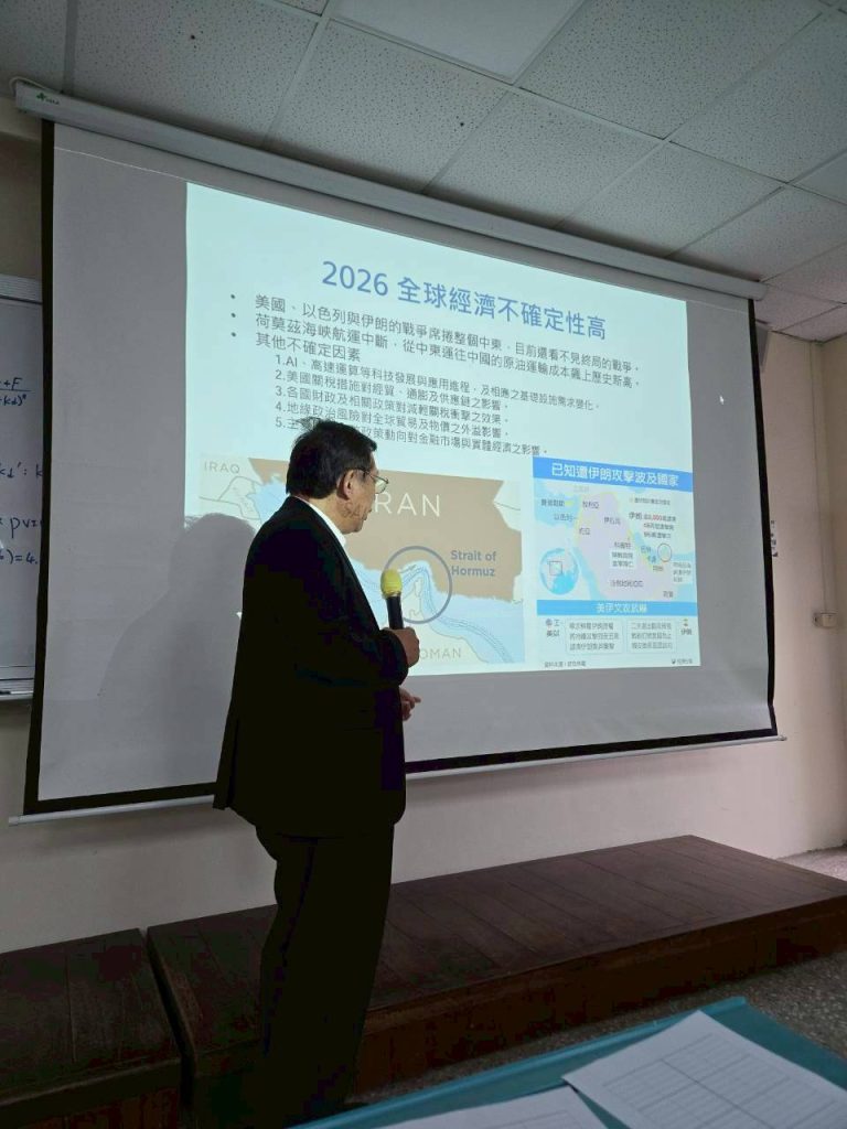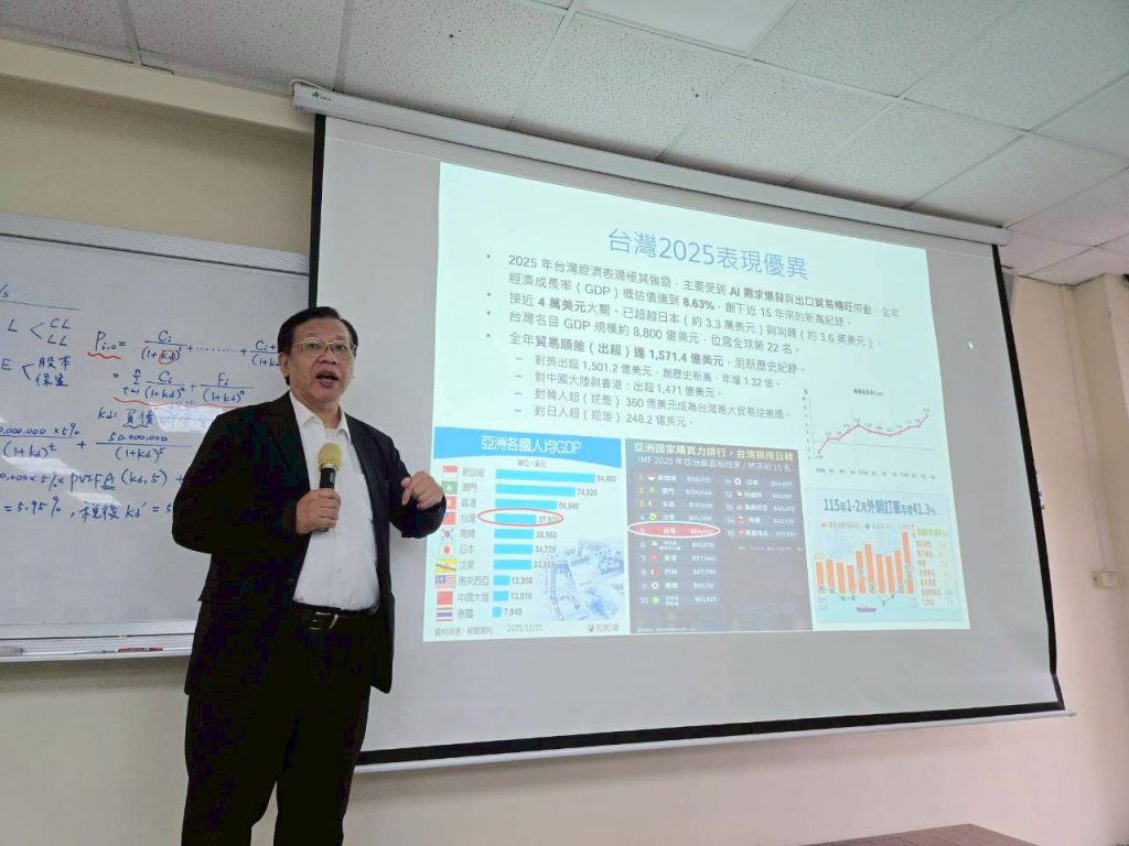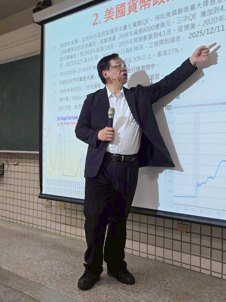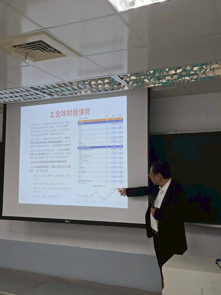 協會理事長林建甫教授深入淺出分析2026全球財經情勢,透過數據與同學講述美國貨幣政策、AI人工智能、金融業經營與金融證照的重要性。