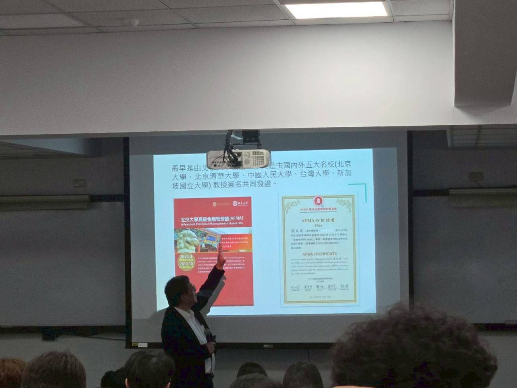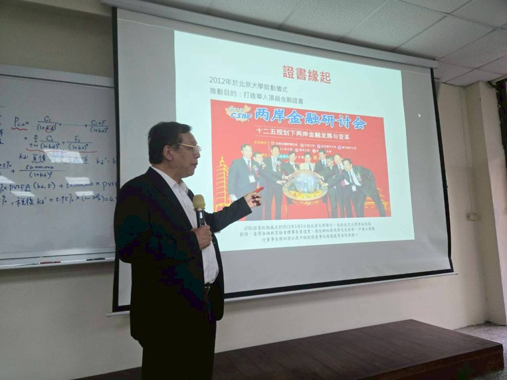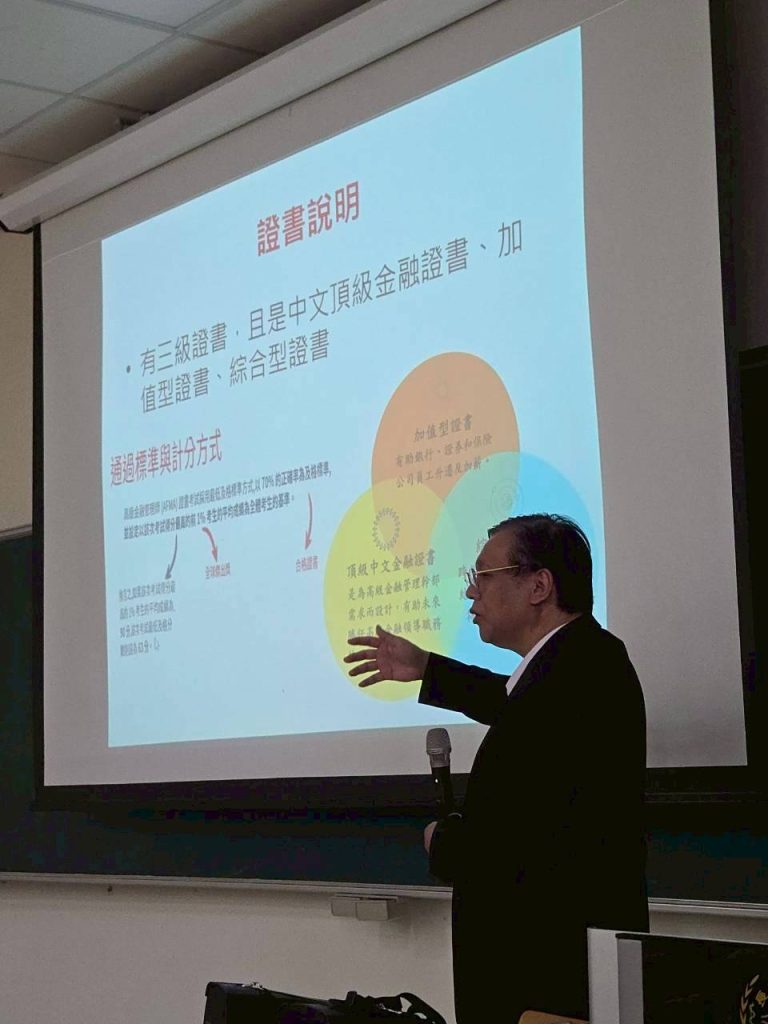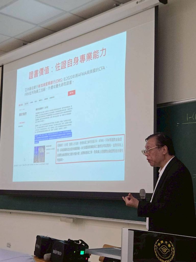台灣金融教育協會與AFMA高級金融管理師委員會,於4月27日下午在中原大學舉辦專題演講「全球財經趨勢與證照敲門磚」,由台灣金融教育協會理事長林建甫擔任主講。