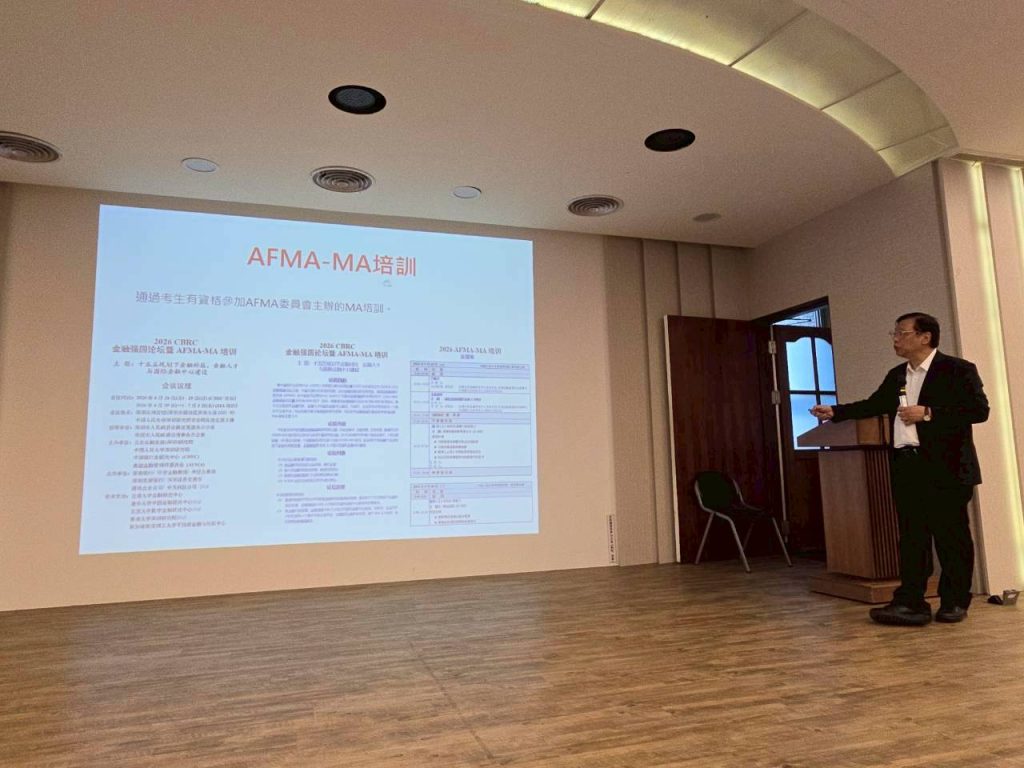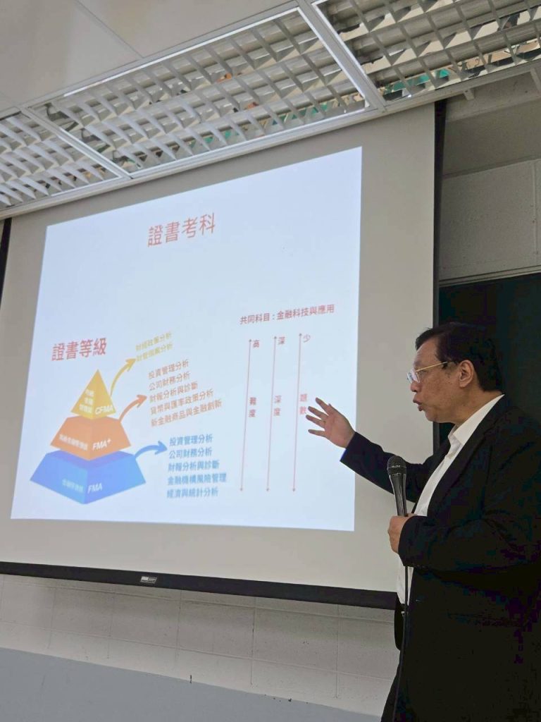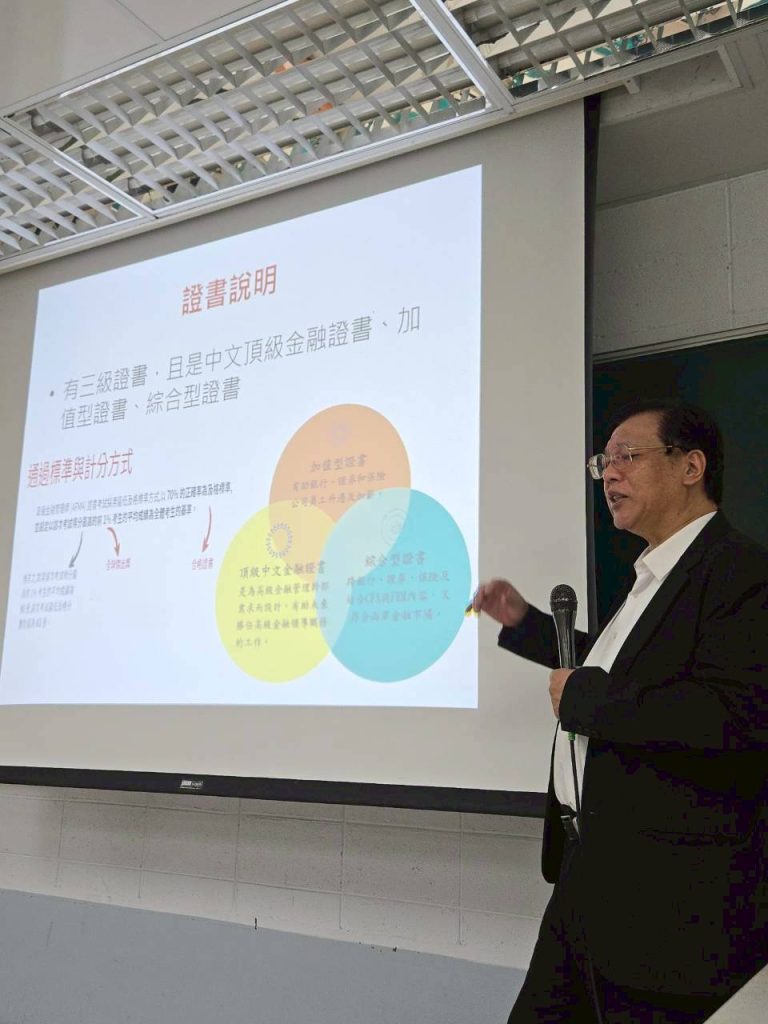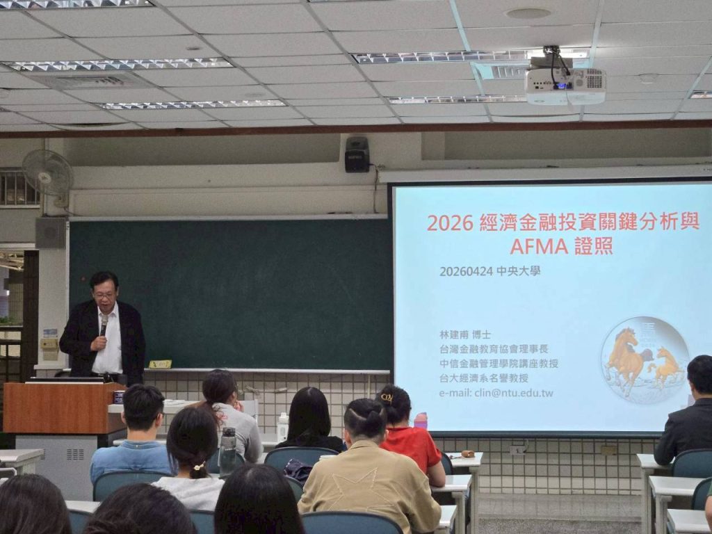 台灣金融教育協會與AFMA高級金融管理師委員會,於4月24日下午在中央大學舉辦專題演講「2026 經濟金融投資關鍵分析與 AFMA 證照」,由台灣金融教育協會理事長林建甫擔任主講。