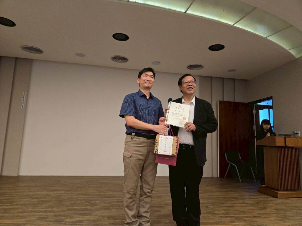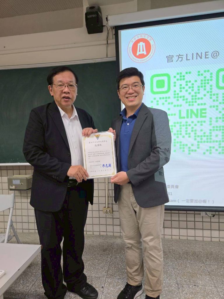 台灣金融教育協會理事長林建甫(左)接受中央大學財金系黃泓人教授(右)致贈感謝狀。