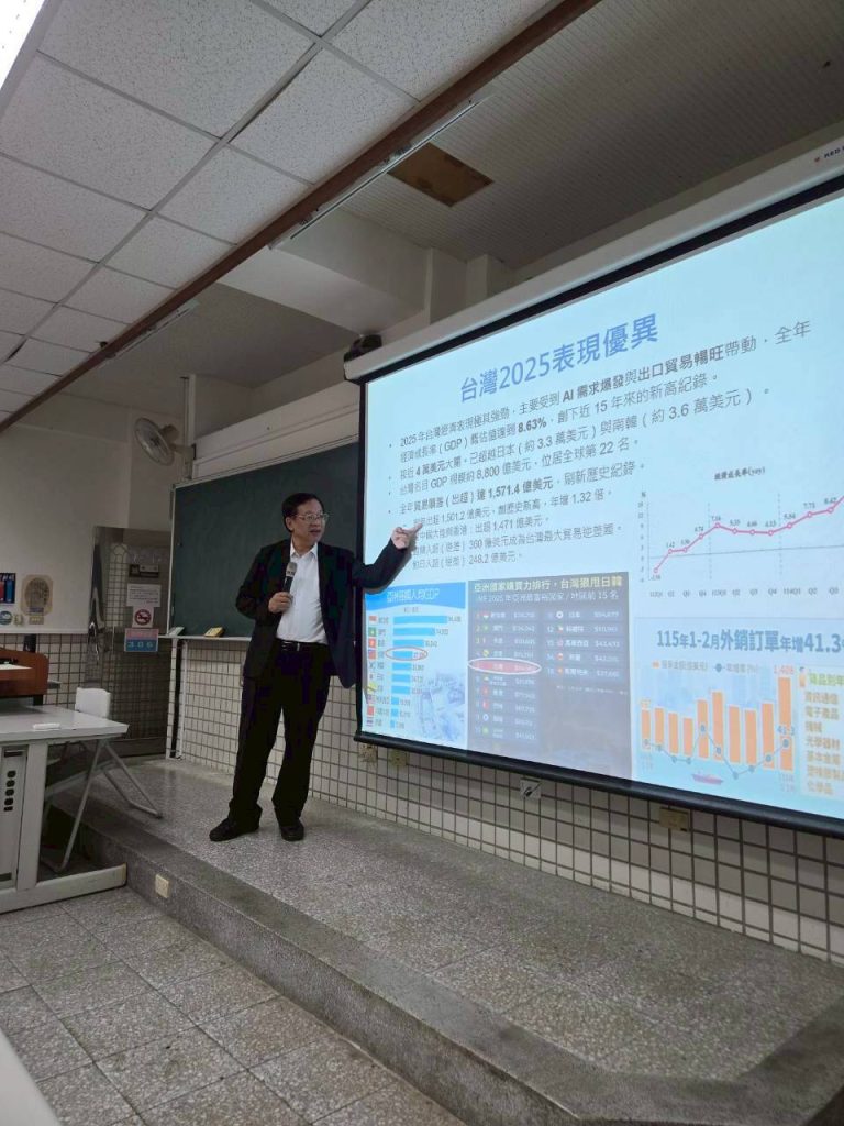 協會理事長林建甫教授講述2026全球財經情勢,透過數據與同學分享美國貨幣政策、AI人工智能、金融業經營與金融證照的重要性,結合現代趨勢連結莘莘學子。
