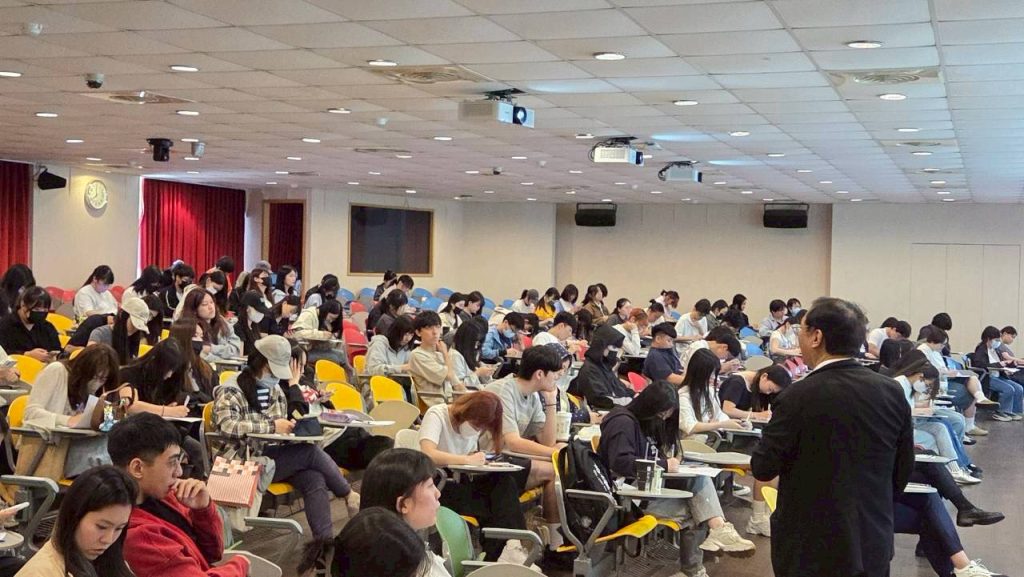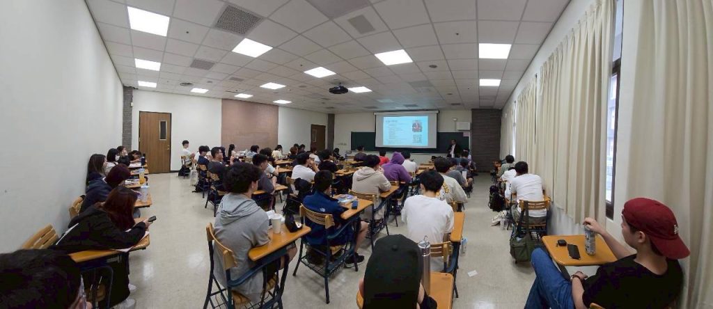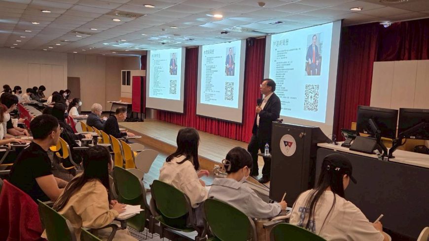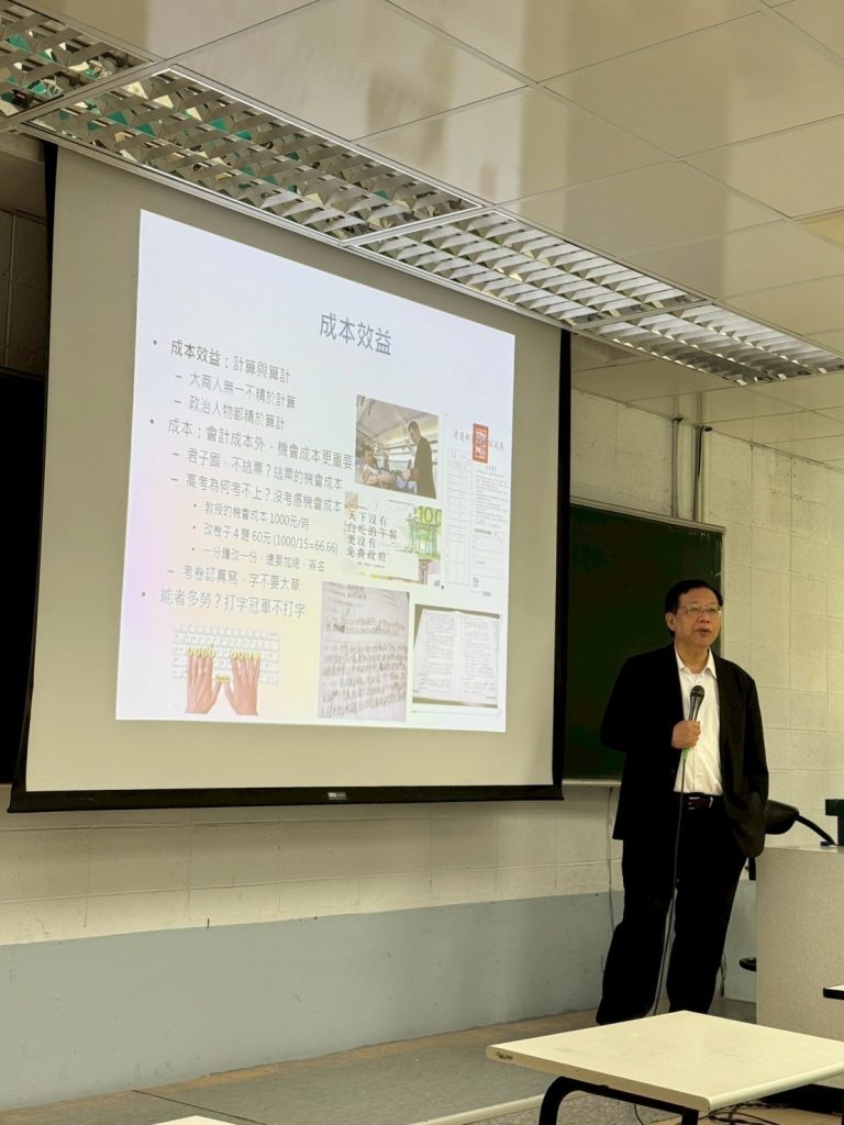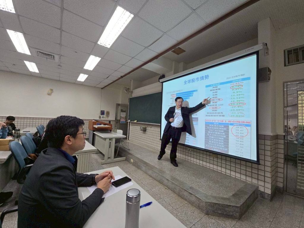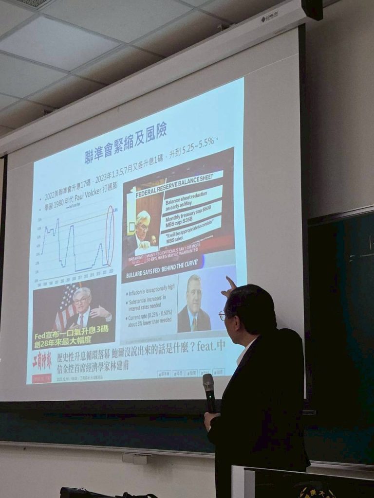 協會理事長林建甫教授深入淺出分析全球財經情勢,透過數據與同學講述AI人工智能、人生經營、金融業介紹與金融證照的重要性。