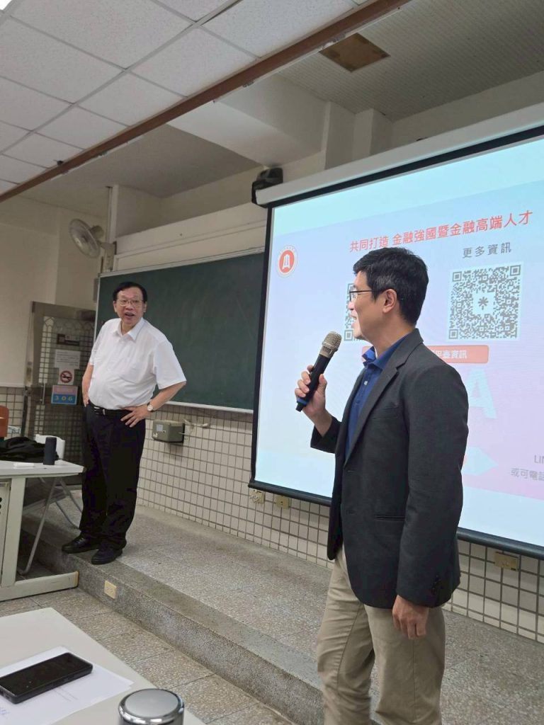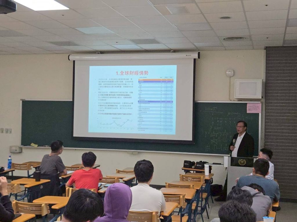 協會理事長林建甫教授憑藉豐富的學養與實務經驗,為學子們剖析經濟學與金融、全球財經情勢、金融業介紹,並勉勵同學在變動的時代中,透過專業證照與自我管理持續學習。