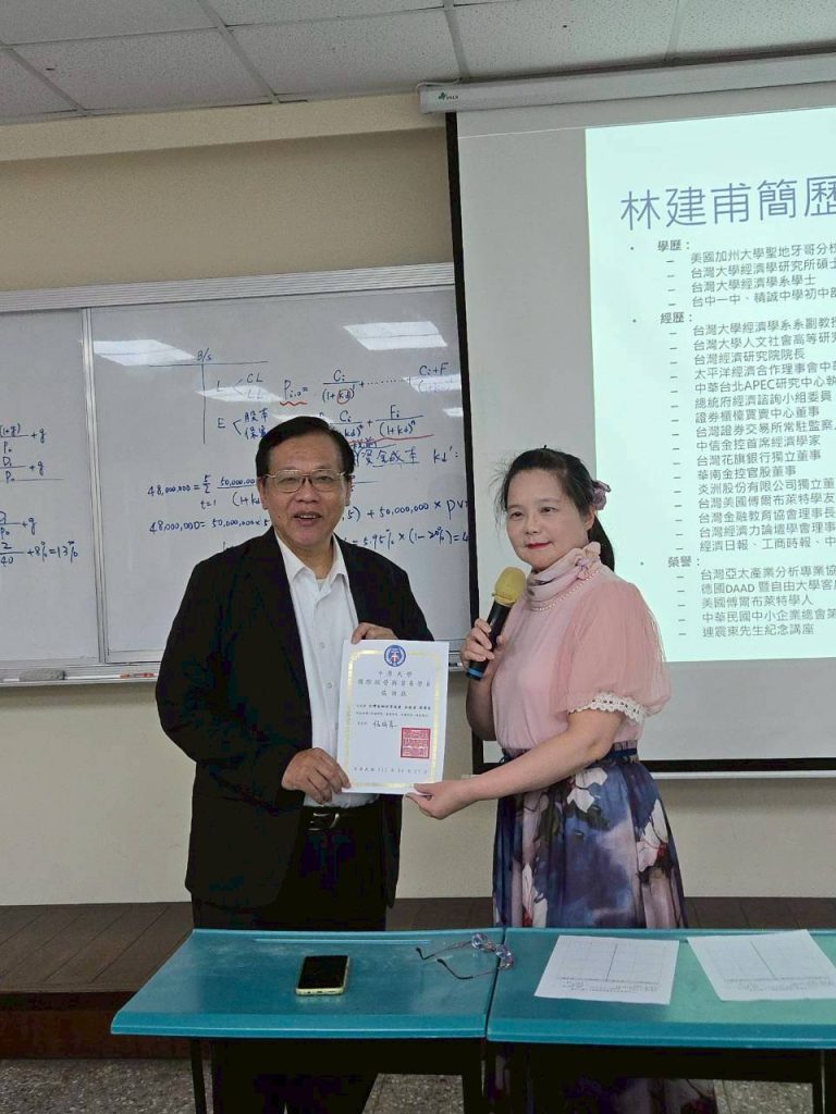 台灣金融教育協會理事長林建甫(左)接受中原大學國際經營與貿易學系方豪教授(右)致贈感謝狀。